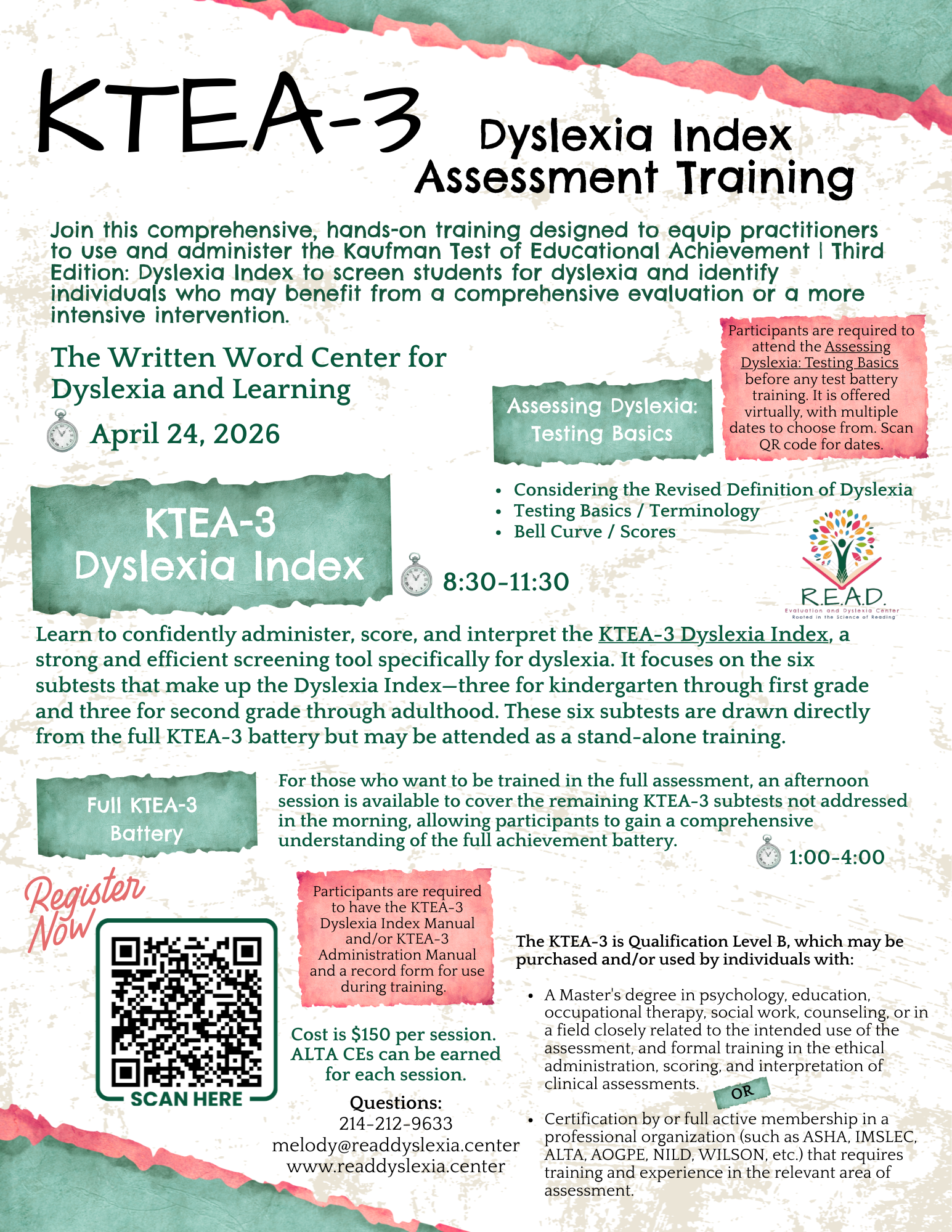 R.E.A.D. Evaluation and Dyslexia Center is offering a multi-day professional training of norm-referenced assessments commonly used for dyslexia screening, progress monitoring, and identification. This comprehensive training is designed to equip dyslexia therapists, reading specialists, interventionists, and educators working in public schools, private schools, and private practice with a clear understanding of the characteristics and underlying causes of dyslexia, along with step-by-step instruction in administering and scoring specific standardized, norm-referenced literacy assessments. The training also provides practical guidance on analyzing assessment data to support informed decision-making and developing meaningful recommendations for appropriate, evidence-based interventions.